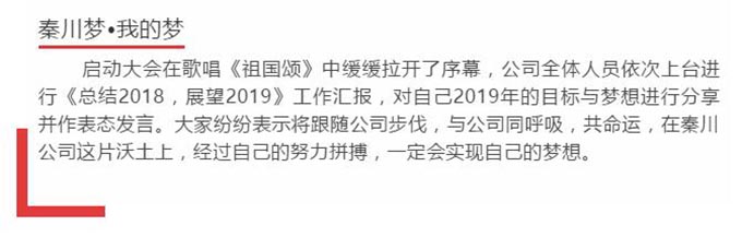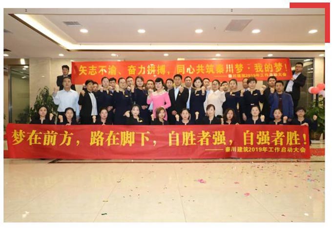 熱烈祝賀陜西秦川建筑工程有限公司“2019年度工作啟動(dòng)大會(huì)”圓滿落幕。秦川建筑全體同仁斗志昂揚(yáng)、迎接新挑戰(zhàn),我們將矢志不渝、齊心協(xié)力、奮力拼搏,同心共筑秦川夢(mèng)·我的夢(mèng),譜寫(xiě)秦川2019新華章。