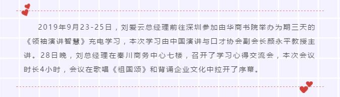28日晚,劉總經(jīng)理在秦川商務(wù)中心七樓,召開了學(xué)習(xí)心得交流會,本次會議時長4小時,會議在歌唱《祖國頌》和背誦企業(yè)文化中拉開了序幕。